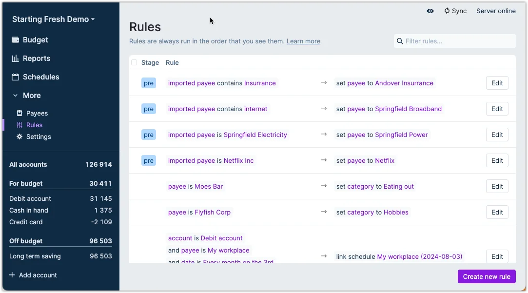 Rules dictate how transactions are handled. When transactions are imported or synced, they follow rules that apply specific actions. For instance, a rule might process a transaction with the payee "AMAZON.COM*5C7QC7MH0 AM 10/26 PURCHASE AMZN.COM/BILL," recognize the keyword "amazon," and automatically set the payee to "Amazon" and the category to "Books". Rules enable you to automate any workflow you choose.