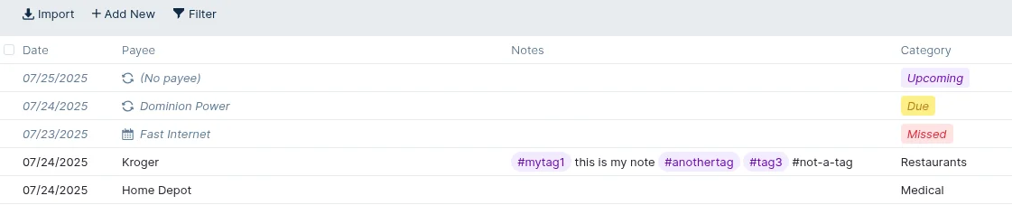 Transactions can be easily flagged and identified in the table by tagging them through their notes. An example would be to tag all transactions for a trip with a tag like #Vacation2025